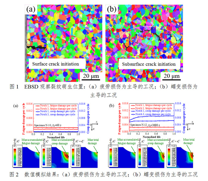 但是在现行的国际规范中,对于多轴蠕变—疲劳的高温部件寿命设计方法尚不成熟。针对这一问题,团队成员基于连续损伤力学,在Chaboche统一粘塑性本构方程中修正了随动强化准则以体现载荷水平对应力松弛行为的影响,从而揭示了复杂几何尺寸下的背应力演化规律及循环应力—应变响应。进一步,基于能量密度耗散准则建立了多轴应力状态下的蠕变—疲劳损伤模型,该模型综合考虑了结构中广泛存在的蠕变棘轮效应及几何不连续处应力三轴度对损伤的影响,与商用有限元软件实现了对接,应用于涡轮盘等高温真实部件的蠕变—疲劳寿命设计。此外,团队成员采用GH4169高温合金进行了一系列650℃下单边缺口蠕变—疲劳验证。模拟和试验结果一致,而且均很好地表明:几何不连续处的裂纹萌生位置依赖于载荷工况。对于以疲劳损伤为主导的工况,其裂纹通常萌生于结构的表面,而以蠕变损伤为主导的工况,其裂纹通常萌生于结构的内部(实验结果如图1、模拟结果如图2)。所以,所提出的设计方法可以很好地描述裂纹萌生的几何结构及载荷相关性。
