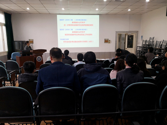为深入学习贯彻全国教育大会精神,进一步规范和加强研究生招生、培养和管理各个环节,提升研究生培养质量,3月21日中午,机械与动力工程学院在学校实验十楼三楼会议室召开2019年度硕士研究生复试工作培训暨全体研究生导师会议。学院党委书记项延训、副书记杨倩、全体导师及参加2019年研究生复试的工作人员参加会议。会议由学院副院长章兰珠主持。
