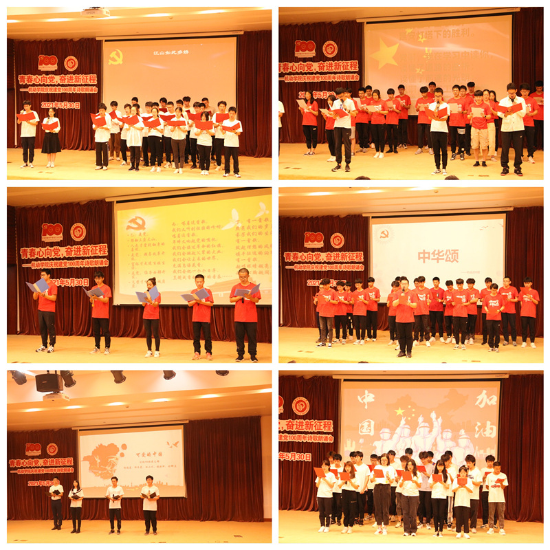 学院2019级、2020级共17个班级团支部依次上台朗诵。同学们朗诵了《百年建党,无双中华》、《永远跟党走》、《百年长路》、《党的礼赞》、《可爱的中国》、《不忘初心、砥砺奋进》等诗篇,以声情并茂的语言带领大家回顾了中国共产党成立100年来带领中国人民不懈奋斗的光辉历程和取得的伟大成就,表达了青年学生对党的满腔热爱和无限向往。