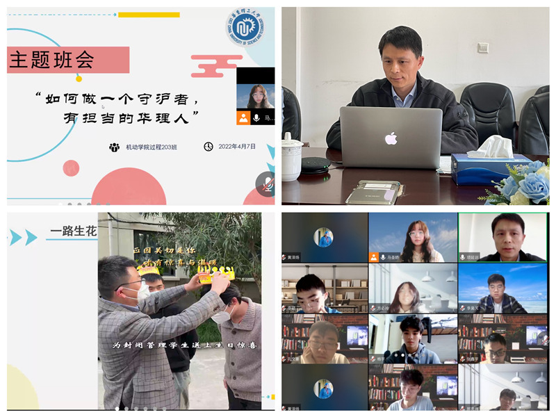 主题班会共分为四个部分。在“锻炼身体,认真防疫”环节,全班同学一起观看了我国奥运健儿在隔离期间进行体育锻炼的视频,随后进行了防疫知识的问答;在“校园封控,生活剪影”环节,主持人展示了封校期间学院和各班级开展的各项战疫“云”活动,大家观看了学院抗疫宣传片《一路生花》视频(教师版);在“不忘学习,心态积极”环节,机械创客社长林天乐等四位同学分享了各自在学习、体育及科创实践等方面的活动,学习委员李硕总结了班级学习情况并鼓励同学们要保持努力学习、积极进取的良好状态,心理委员吴建越讲解了封校期间心理调节方法,引导同学们培养积极客观的心态;在“奋进担当,展望未来”环节,班长李昊天和班导师田鹏飞分别作了总结,号召同学们要积极配合学校疫情防控政策,做一个有担当的华理人。