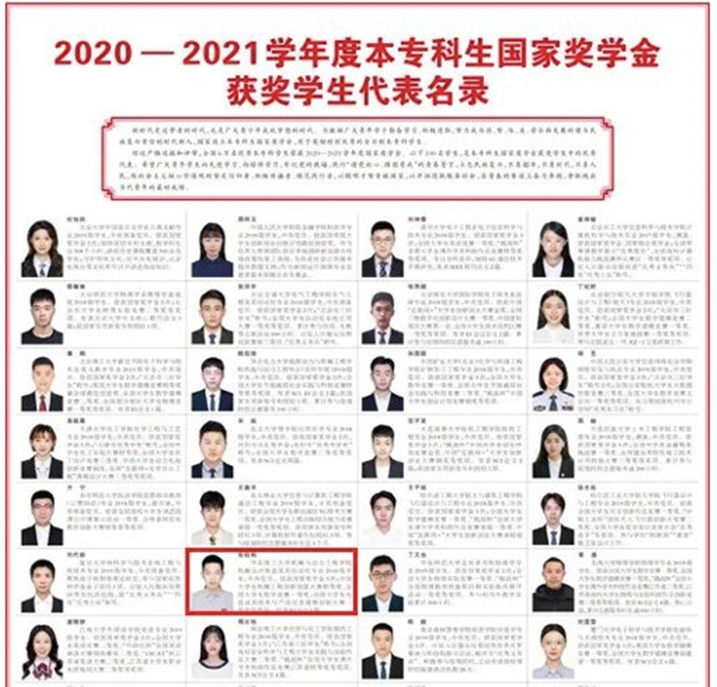 5月4日,《人民日报》刊登《2020-2021学年度本专科生国家奖学金获奖学生代表名录》,我校机械与动力工程学院机械设计制造及其自动化专业2018级本科生张钰炯从6万名本专科国家奖学金获奖学生中脱颖而出,作为全国100名优秀学生代表荣登该名录。