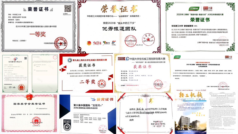 张龙涵、虞泽宇,国家级大创多功能模块化居家整理机器人核心成员,获得中国大学生知行计划全国金奖、团中央三下乡“全国优秀报道团队”、“知行杯”上海市二等奖等十余项国家级奖项,两个省部级奖项,两个校级奖项。
