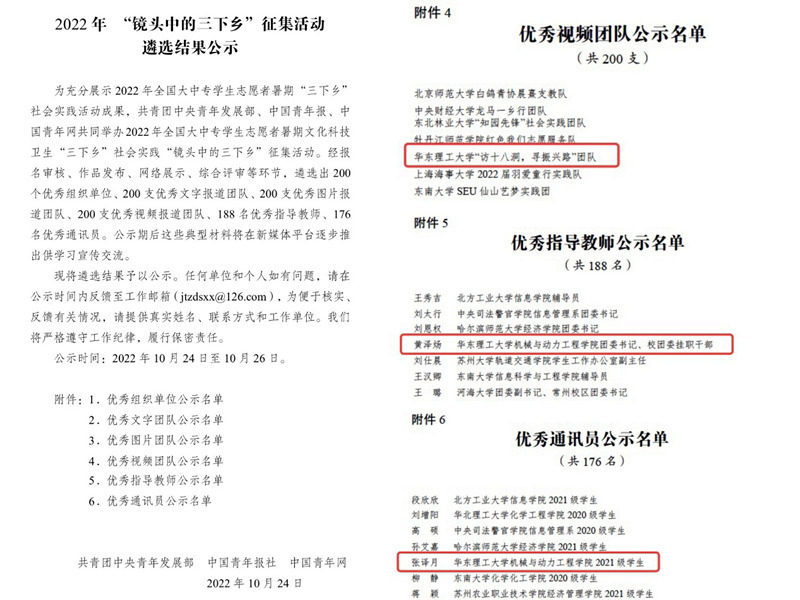 近日,团中央青年发展部、中国青年报社、中国青年网共同主办的2022年全国大中专学生志愿者暑期“三下乡”社会实践“镜头中的三下乡” 成果遴选活动评选结果正式揭晓,我院社会实践团荣获三项荣誉,其中包括全国优秀视频团队1支、优秀通讯员1名、优秀指导教师1名,这也是我院连续四年获评团中央“三下乡”、“千校千项”等全国优秀团队和个人。