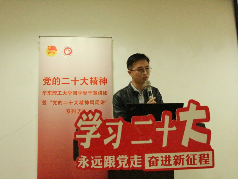 11月22日下午,由校团委主办,机动学院团委承办的党的二十大团学骨干宣讲团“党的二十大精神周周讲”系列首场宣讲活动在奉贤校区大活215举行。2019年度“中国大学生自强之星”、2020上海大学生年度人物获得者、机械与动力工程学院博士后刘懿谦做了主题为“服务海洋强国战略 把论文写在蓝色国土上”的宣讲。