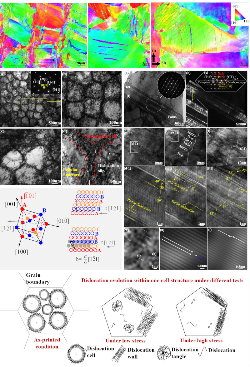 近日,华东理工大学机械与动力工程学院的硕士研究生陈亦楠围绕L-PBF增材制造面心立方晶体(FCC)结构的CoCrFeNi高熵合金在交变载荷工况下的疲劳行为及损伤演变机制持续深入研究;发现激光快速非平衡熔凝的CoCrFeNi微观结构含有高密度的小角度晶界、异常显著的晶内胞状亚结构和原子堆垛层错特征,促使在较低应力水平的交变应力下诱发大量纳米孪晶,建立和阐明了上述因素交互作用的物理机制模型;探明了在L-PBF增材制造CoCrFeNi疲劳行为中的位错胞(Dislocation cells)演变过程及其与晶内胞状亚结构(Cellular structures)的交互作用机理,位错受胞壁结构(Cellular walls)阻碍、在一定范围往复移动导致位错湮灭、解离和重排,位错重排则倾向于形成较低能量构型,即具有交替高-低密度位错区域的新型位错胞壁(Dislocation cell-walls),这不仅改善了高周疲劳性能,同时能阻碍位错的大范围移动,为反应生成纳米孪晶提供了更大可能;此外,通过施密特因子计算及相同尺寸、不同取向的晶粒内部诱发孪晶比例量化对照,意外发现L-PBF增材制造FCC系列HEAs纳米孪晶更易在<110>取向的晶粒内部产生,这可为通过L-PBF激光工艺改变微观晶粒取向分布、实现构-性精准调控和强韧取向性的人工设计,提供新的可行路径。