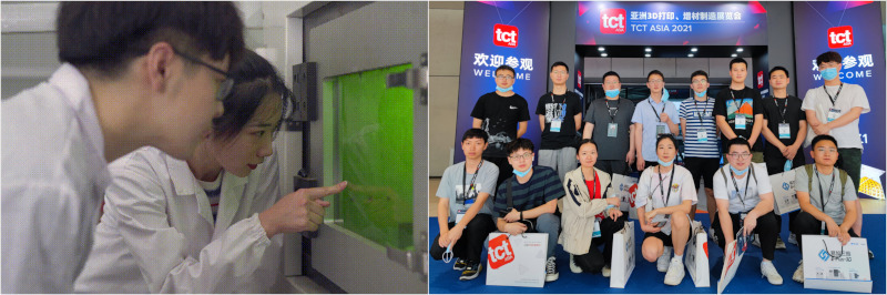 图3 增材制造与智能装备团队研究生活动剪影(左图:陈亦楠与小组成员合作开展L-PBF工艺探索;右图:团队研究生赴TCT亚洲3D打印展会交流学习)