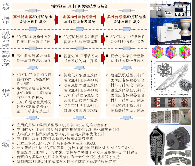近年来,我院轩福贞教授和李博副教授“增材制造与智能装备”研究团队在3D打印智能装备创成、高性能金属结构件增材制造及应用、复杂功能构型智能设计与3D打印、混合柔性电子3D/4D打印等方面取得一系列科研成果,在中国航天科工集团四院、中国航天科技集团八院、中国航发商发公司等航空航天领域重要院所,以及过程装备、新能源、医疗健康等多个行业民营科技企业持续开展合作和科技成果转化,支持重点型号装备关键件制造与服役。