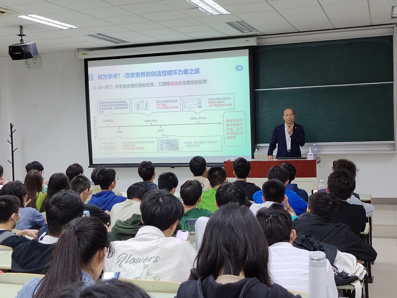 轩福贞从“何为学术”与“学术何为”讲起,围绕科技创新驱动产业革命和人类社会变革的发展历程,深入浅出地阐释了学术改变世界的创造性破坏力量和推动作用。面向未来环境、资源、安全等难题与挑战,轩福贞与同学们分享了自己专注做“安全可靠的智能装备”的科研心路历程。他结合丰富的研究案例,分享了自己和团队30年余来创新探索、从“被动”走向“主动”、深耕安全智能装备研究的科研心得,重点介绍了上海智能感知与检测技术重点实验室在智能传感与泛在感知、高端装备智能运维与诊断等前沿技术的研究进展。引导大家领会“创新精神”的重要内涵,深入思考面对世界百年未有之大变局和中华民族伟大复兴战略全局,应该如何保持与时俱进、成长为主动适应不断变化的形势和未来社会发展需要的创新型复合型人才。
