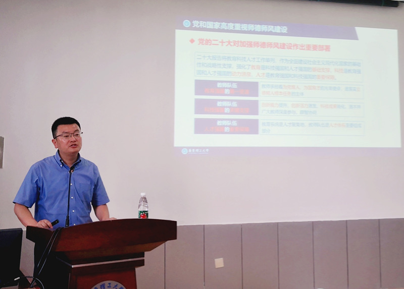 学院党委书记杨强以“以党的二十大精神引领新时代高校师德师风建设”为主题,带领学院教师学习了党的二十大对加强师德师风建设作出的重要部署以及习近平总书记关于教师队伍建设的重要指示批示精神。他解读了教育部以及学校关于高校师德师风建设相关文件,通报了近年来违反《新时代高校教师职业行为十项准则》的典型案例,希望学院教师引以为戒,牢固树立底线意识,自觉筑牢思想防线,坚守为党育人、为国育才的初心,不断涵养高尚师德,以德施教、以德育德,争做大先生,做学生为学、为事为人的示范,营造风清气正的育人环境。