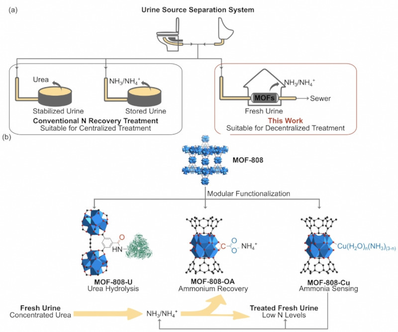秉持长期以来污染物源头控制与资源化的理念,近日,我校与阿肯色大学、加州理工大学的合作者,采用水稳定的MOF-808为基体,开展精准多位点后修饰策略,同步实现其对生物活性脲酶的固载稳定化、草酸后修饰下的高容量铵根离子吸附和Cu离子调控下的氨分子显色检测,将尿液中的尿素原位转化为氨氮并吸附回收,形成模块式可视化尿液资源回收系统。