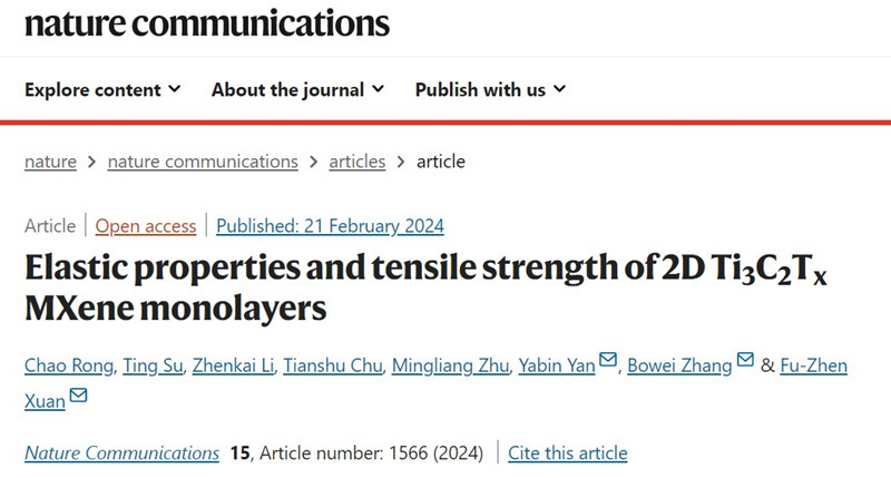 近日,我校机械与动力工程学院张博威等在Nature Communications 上发表了题为 “Elastic properties and tensile strength of 2D Ti3C2Tx MXene monolayers” 的研究论文,在线报道了该课题组在Ti3C2Tx基柔性传感材料结构强度领域的研究进展,提出一种可靠、直接、定量的方法来测量单层Ti3C2Tx纳米片的力学性能。
