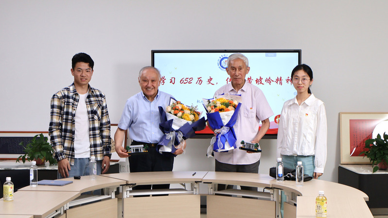 课后,同学们纷纷与两位老先生合影留念,并为其献上鲜花和最新版华理校门模型,表达对两位老先生的尊敬和祝福。
