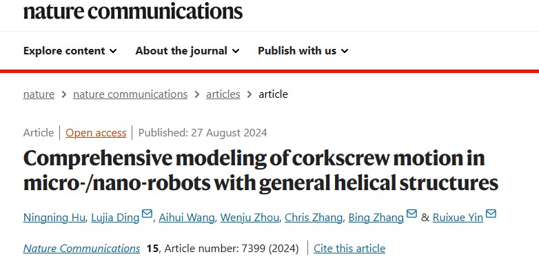 近日,我校机械与动力工程学院殷瑞雪等在《Nature Communications》上发表了题为“Comprehensive modeling of corkscrew motion in micro-/nano-robots with general helical structures”的研究论文,提出一种无结构限制的通用微纳机器人(MNRs)动力学模型,有助于在临床环境中通过定制个体患者来规划MNRs的导航,也有助于了解血液在与MNRs相互作用时的行为,例如血管堵塞等,从而预防MNRs靶向治疗中引起的并发症。